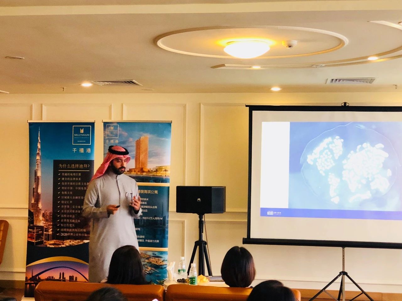 緊接著,遠(yuǎn)道而來的千禧港項目發(fā)展商代表Abdullah AI Ajaji先生為介紹了迪拜的投資環(huán)境及投資價值并帶來了迪拜五星級酒店公寓【千禧港】項目的路演。他分析表示,有別于國內(nèi)房產(chǎn)受政策牽引、美國房產(chǎn)受市場牽引,迪拜房產(chǎn)更趨向于需求牽引。
