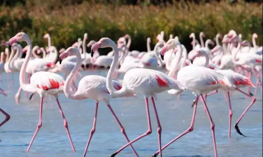 每年的2月和3月之間,2萬只粉紅色的火烈鳥會飛到拉納卡鹽湖過冬,溫暖的陽光,粉嫩的火烈鳥,動。
