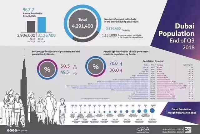 據迪拜統計中心(DSC)的統計數據顯示,迪拜的常住人口現在為313萬6400人,而酋長國的“白天流動”人口為429萬1400人。當然這個數字考慮了非居民和臨時迪拜居民,例如休閑和度假的人。