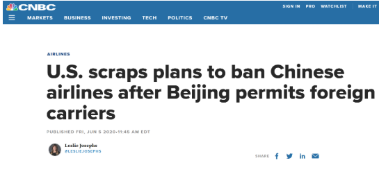 美國交通部出臺新的命令(ORDER 2020-6-3),宣布美方將允許中國內地航空公司運營中美直飛航線,但不得超過每周兩班,立即生效。