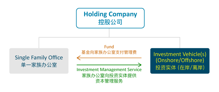 簡言之,管理自己家族財富的單一家族辦公室無需再向新加坡金管局申請有關對應的基金管理牌照。通常,新加坡金管局會將以下架構視作為為典型的單一家族辦公室: