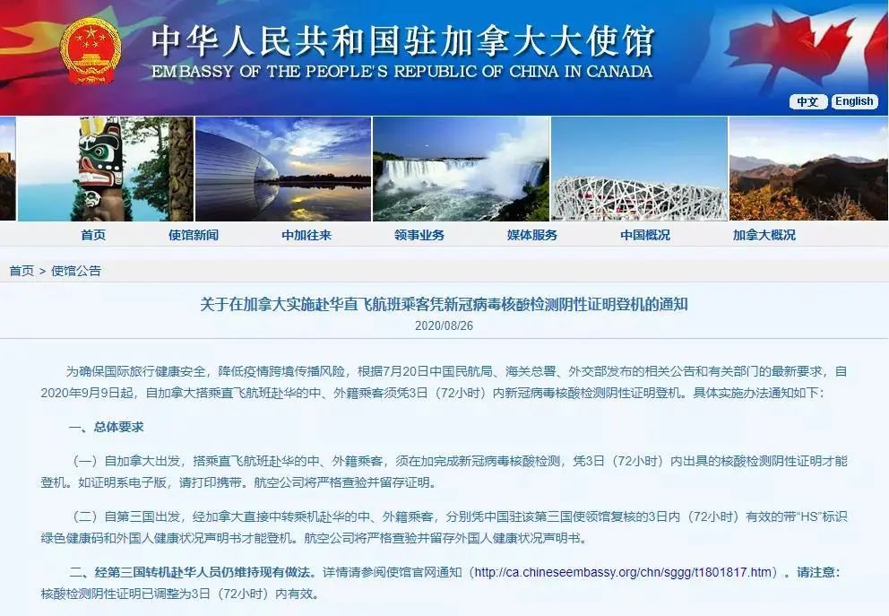 為確保國際旅行健康安全,降低疫情跨境傳播風(fēng)險,根據(jù)7月20日中國民航局、海關(guān)總署、外交部發(fā)布的相關(guān)公告和有關(guān)部門的最新要求,自2020年9月9日起,自加拿大搭乘直飛航班赴華的中、外籍乘客須憑3日(72小時)內(nèi)新冠病毒核酸檢測陰性證明登機。