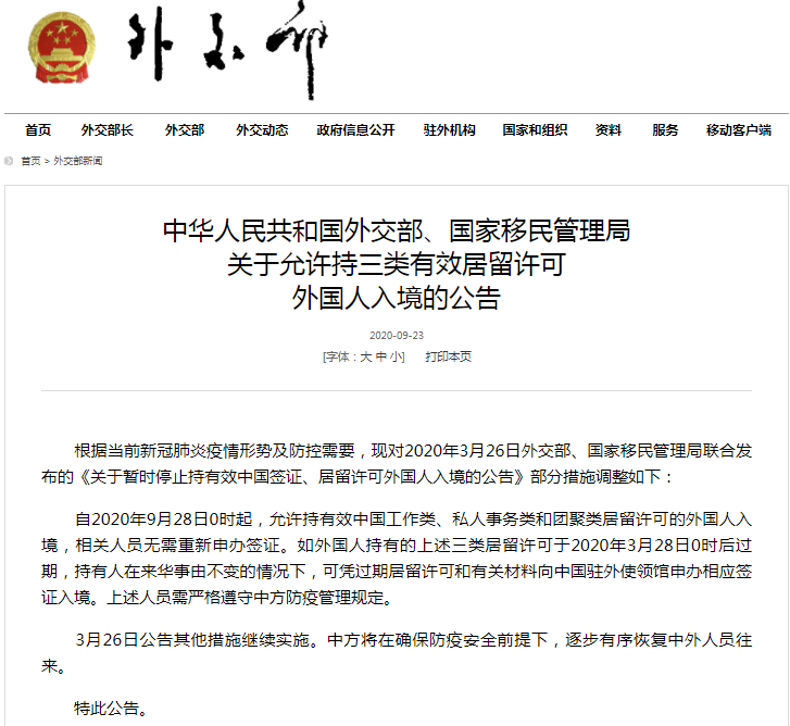9月23日,中國外交部發布和國家移民管理局了《關于允許持三類有效居留許可外國人入境的公告》。具體內容如下:自2020年9月28日0時起,允許持有效中國工作類、私人事務類和團聚類居留許可的外國人入境,相關人員無需重新申辦簽證。