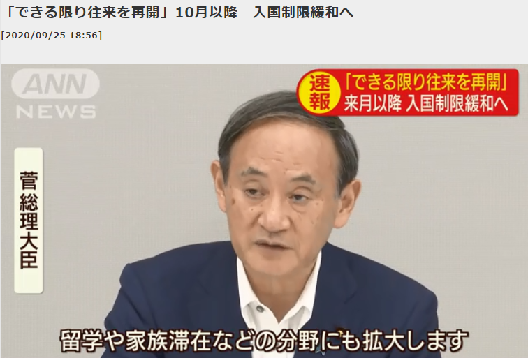 9月25日,日本首相菅義偉在新型冠狀病毒感染癥對策總部會議上,關于作為防疫措地施一環實施的入境限制表示,將以商務及留學等長期逗留者為主要對象,對所有國家和地區有條件地放寬限制。此舉將于10月1日啟動,對象不包括游客。對于入境人數將限定范圍,力圖兼顧防止疫情擴大和經濟活動。
