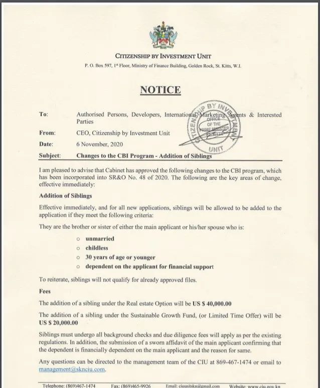 圣基茨和尼維斯移民局11月6日發布通知,從即日起,允許主申請人將兄弟姐妹納入投資入籍申請案,前提是他們要符合下列條件: