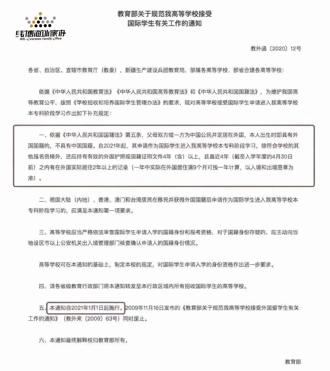 教育部發布《關于規范我高等學校接受國際學生有關工作的通知》,對國際學生進入中國高等院校本??齐A段學習的申請資格進行調整。須持有有效的外國護照或國籍證明文件4年(含)以上,且最近4年之內有在外國實際居住2年以上的記錄,通知自2021年1月1日起施行。