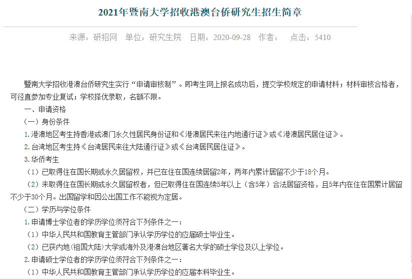 2020年9月,暨南大學發布《2021年港澳臺僑研究生招生簡章》,與往年只招收本科不同的是,此次是該學校首次對外公開針對港澳臺華僑生招收碩士研究生。