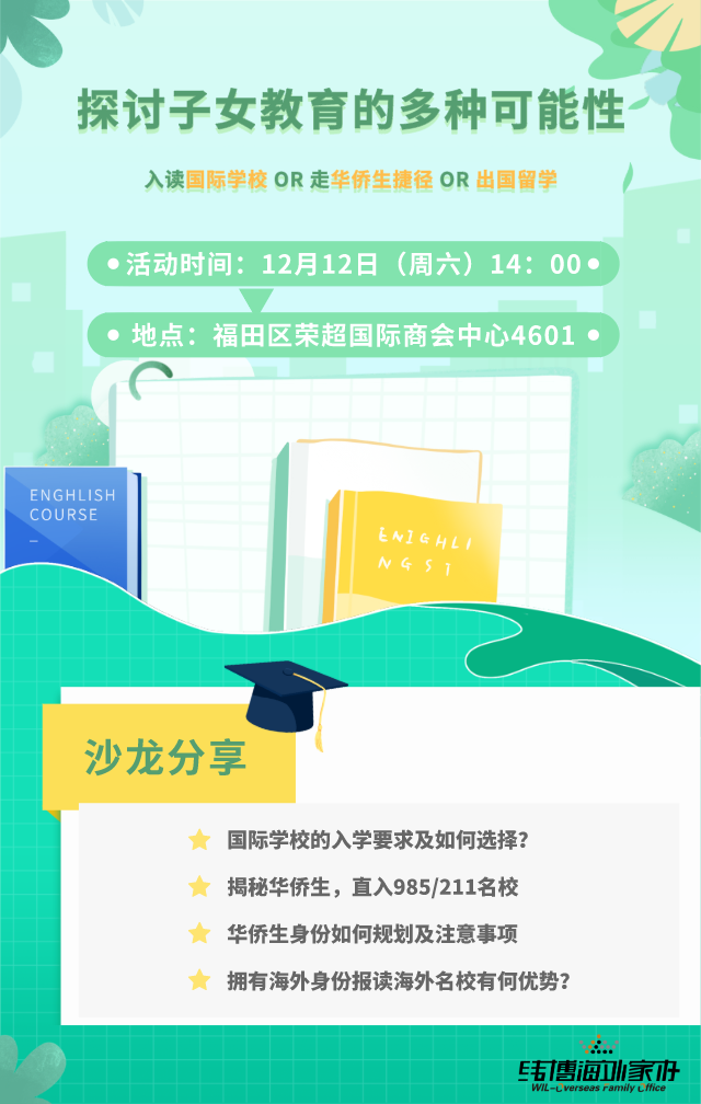 重點來啦,緯博海外家辦在本周六(12月12日)將舉辦沙龍分享,與大家共同探討子女教育的多種可能性。相信盡心盡力為了孩子的你,一定不會缺席。